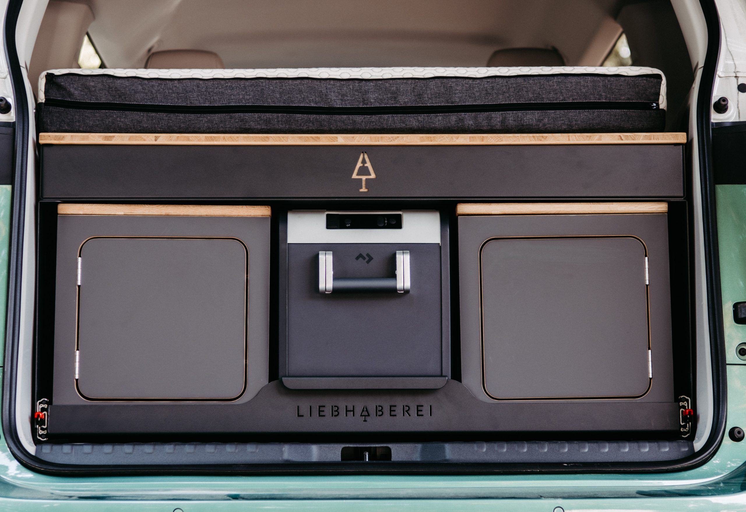 Die Liebhaberei Heckküche und Schlafsystem eignet sich für die Kombination mit der Volkswagen ID Buzz 3er Sitzbank und dient als ergänzende Liegefläche. Die Heckküche sorgt für ausreichend Stauraum, Flexibilität und die Möglichkeit auf Frischwasser Versorgung. Die trendgerechte, samtig-warme Haptik lädt zum Wohlfühlen ein.